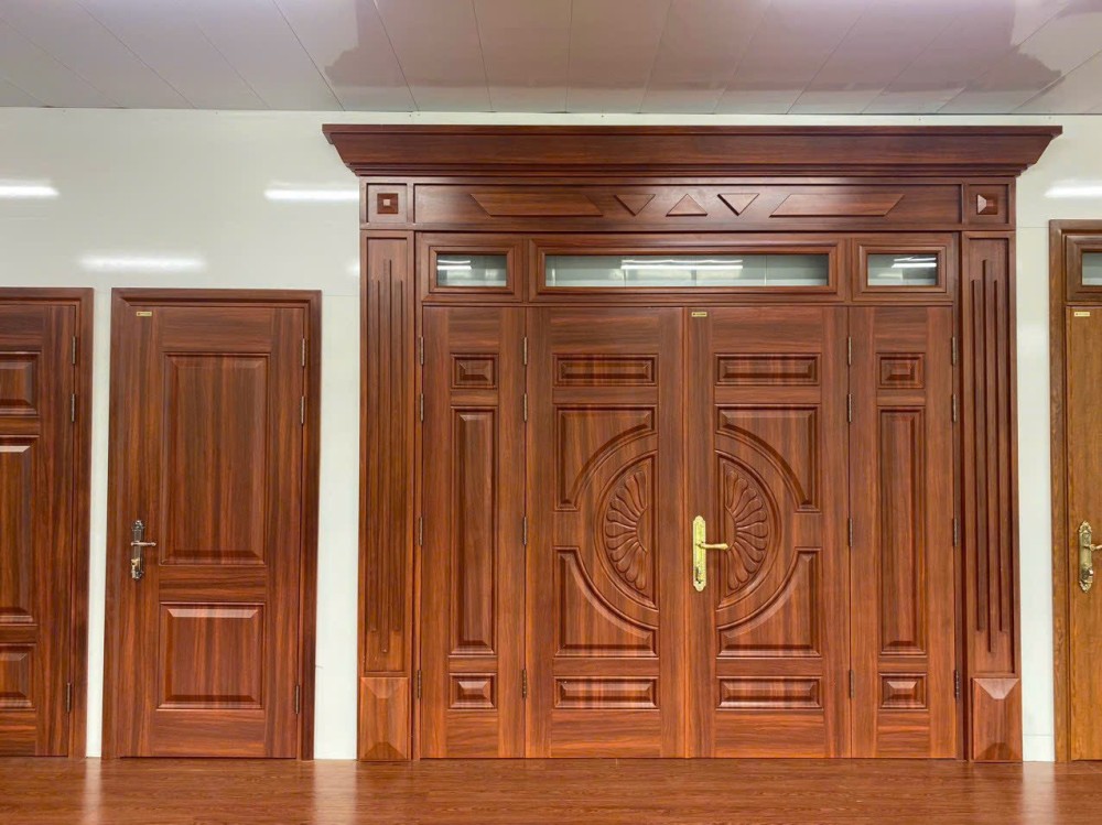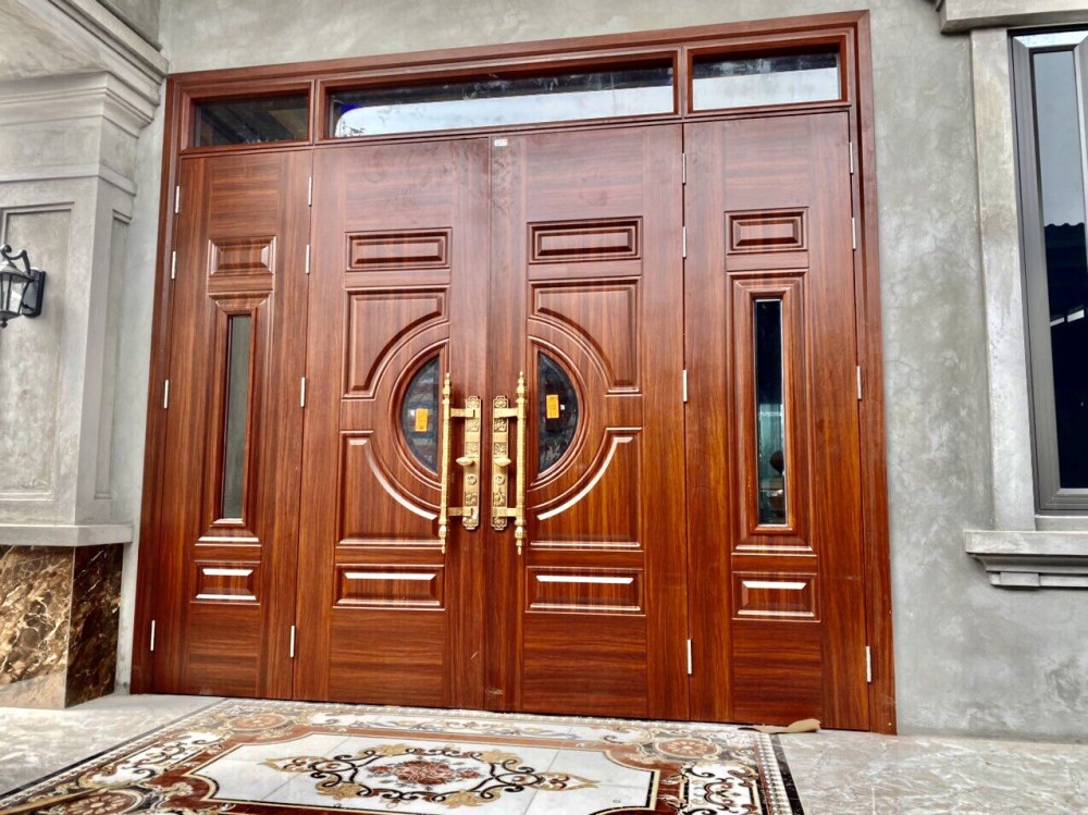 - Cửa Thép Vân Gỗ 4 Cánh: Kích thước lớn, thích hợp cho cửa chính của biệt thự, nhà hàng hoặc khách sạn